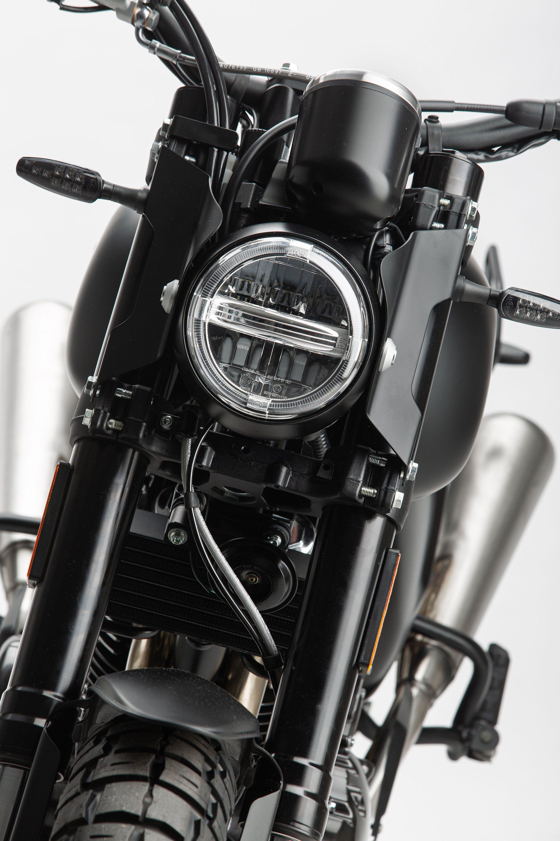 The Outlaw 500 is the villainous version of the Outlaw 125. This superb neo-retro motorcycle was designed by Garage SWM and is the second concept after the SWM Ace of Spades. The Outlaw 500 has all the characteristics of a true scrambler. The exhaust placed in height and oriented upwards forms with the studded tires of the beautiful 17-inch wheels a beautiful whole. The wide, straight steering wheel ensures a comfortable seating position. The round headlight fits into the neo-retro image but completely follows the trends thanks to its LEDs. With this neo-retro motorbike you discover a new world full of adventures and fun rides!