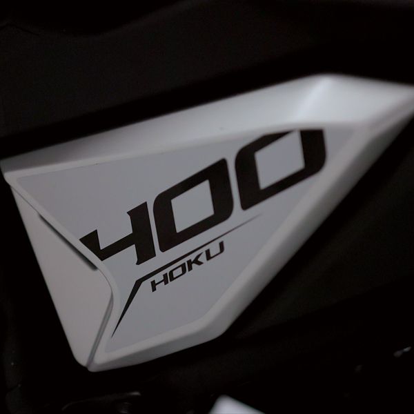 La hoku 400 forme un magnifique ensemble d’aspects techniques et esthétiques. Le châssis treillis laqué noir assure un équilibre parfait entre stabilité et maniabilité. L’échappement sportif, orienté vers le haut, donne à la Hoku une apparence prononcée.